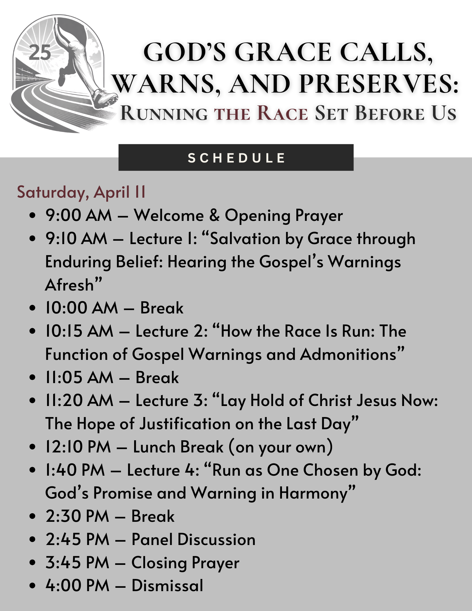 As we mark the Silver Anniversary of the publication of The Race Set Before Us, written by Ardel B. Caneday and Thomas R. Schreiner, this seminar reflects on the glorious coherence of God’s saving grace. The gospel does more than summon us to believe; it continues to call, to warn, and to preserve us as we run the race set before us. Scripture assures us that those whom God has chosen, called, and justified will surely be glorified. Yet the same gospel urgently exhorts us to endure in faith, to lay hold of Christ Jesus, and to press on toward the hope of justification on the Last Day.